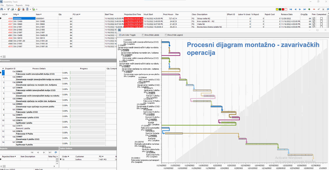 Kroz isti BOM povezuju se i informacije o pomoćnoj opremi (tools, dies, inserts, fixtures), što kasnije omogućava Scheduling modulu da detektuje konflikte pomoćne opreme kada više naloga istovremeno pokušava da koristi isti alat ili šablon. Na taj način BOM ne definiše samo „šta i kako“ se radi, nego i „čime“, što je ključno kada se kasnije radi Rough Cut Capacity i Capacity Whiteboard analiza po tipovima mašina, ćelijama i alatima.