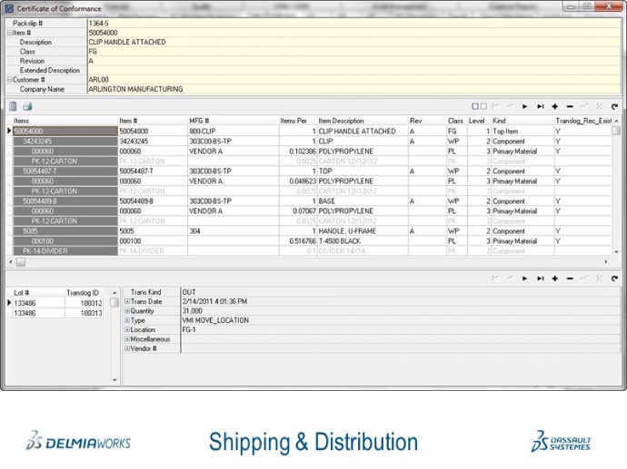 Shipping and Distribution modul u DelmiaWorks‑u pokriva sve što se dešava od trenutka kada je roba spremna za isporuku, do trenutka kada je fizički napustila magacin, uključujući pakovanje, generisanje packing slip‑ova, Bill of Lading (BOL), EDI ASN poruke, obračun transporta, VMI isporuke i obradu povrata kroz RMA. Ideja je da se ceo proces isporuke vodi u istom sistemu koji vodi Sales Order, inventar, WMS, etikete i finansije, tako da svaki komad koji izađe iz fabrike ima čist trag – od SO release‑a, preko lokacije i serijskog broja do fakture i eventualnog povrata.