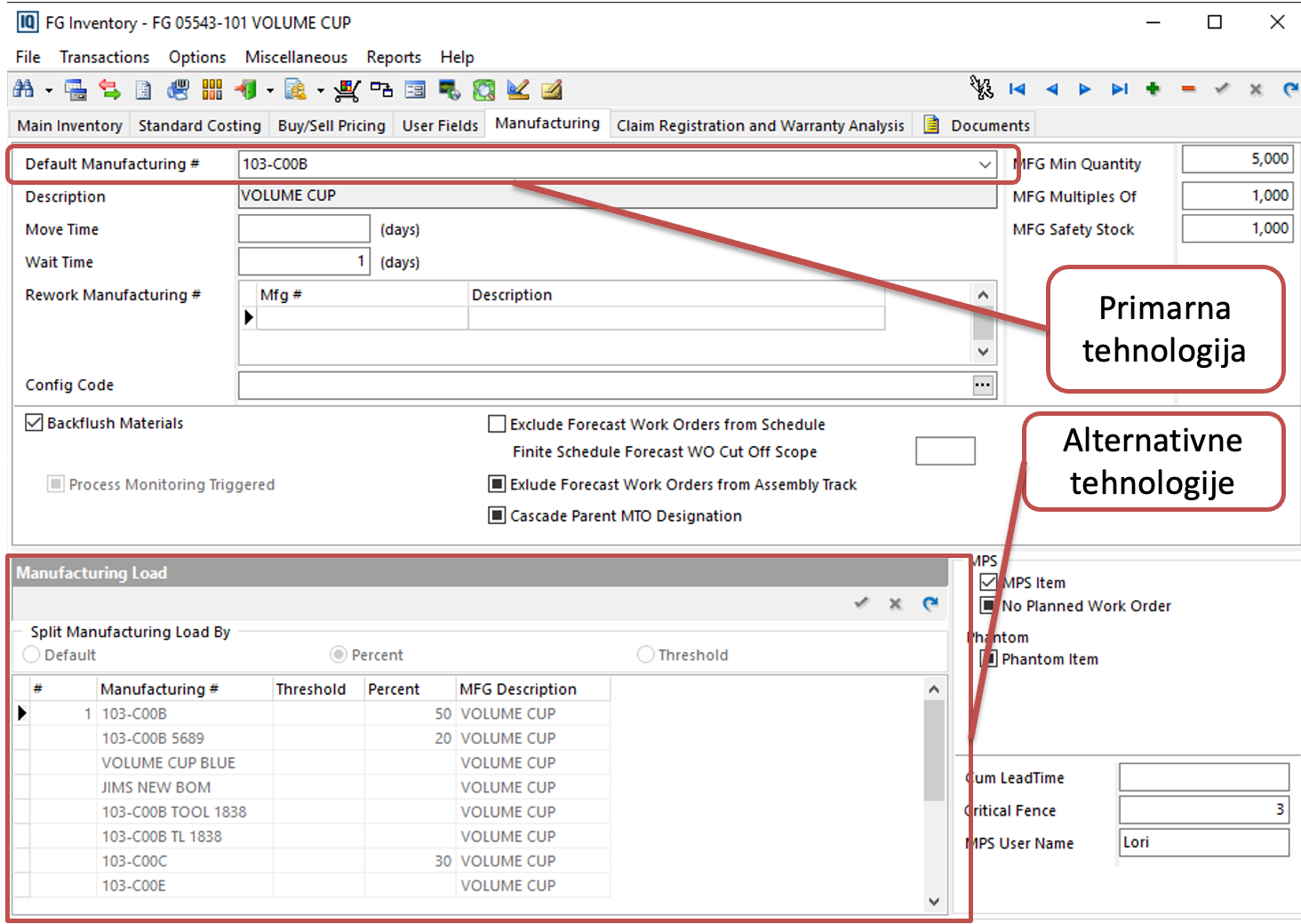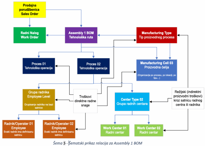 Tek kada su Manufacturing Type‑ovi, Center Type‑ovi, Work Center‑i i Cells definisani, ulazi se u BOM i Manufacturing Configuration: za svaki ključni artikal ili porodicu artikala definiše se BOM (materijali, scrap, substituti, alternate BOM‑ovi) i set operacija u skladu sa izabranim Manufacturing Type‑om (Center Type, cycle time, rad, kvalitet, pomoćna oprema). Time nastaje Manufacturing Configuration koji MRP i Work Orders kasnije koriste za planiranje količina, vremena i kapaciteta, kao i za RealTime praćenje i kosting.