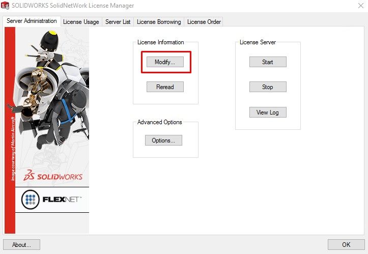 Pri pokretanju ovog programa, u tabu Server Administration, kliknite na dugme Modify... kao što je prikazano na slici iznad.