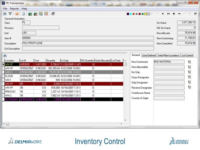 Inventory Control modul u DelmiaWorks MES i ERP rešenju za proizvodnju pomaže vam da u potpunosti pratite magacin materijala koje koristite u proizvodnji, da u svakom trenutku znate pravo stanje, da možete blagovremeno da održavate magacin bez prekomernog zarobljavanja kapitala i bespotrebnog zauzimanja prostora.