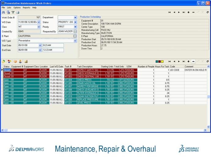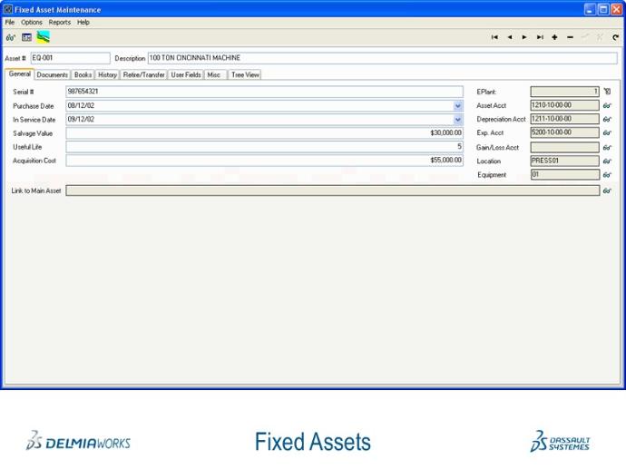 DelmiaWorks ERP modul za praćenje imovine kompanije od mašina i opreme do objekata, zajedno sa povezanim troškovima održavanja.